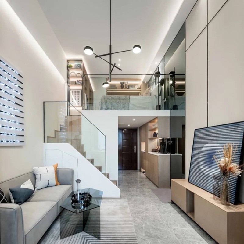 这是典型的现代极简+高效收纳风格,适配小层高、小面积的LOFT或微型公寓,核心是通过极致的空间整合与简约美学,在有限面积内实现居住、办公、储物等多元功能。