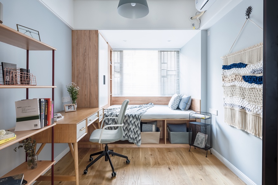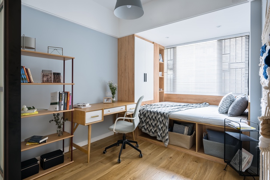 将睡眠、办公、收纳三大功能整合在一个空间里,书桌与床品区域无缝衔接,动线清晰且不浪费面积。以浅木色为主基调,搭配雾霾蓝墙面与白色柜体,营造出温暖又清爽的视觉效果。大面积百叶窗保证了充足的自然光,同时保护了隐私。床底设置了开放式储物区,用布艺收纳篮分类存放物品,拿取方便。左侧的开放式置物架可以展示书籍与装饰摆件,兼具实用与美观。墙面嵌入式柜体与书桌抽屉提供了封闭收纳空间,避免视觉杂乱。