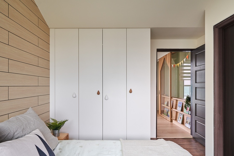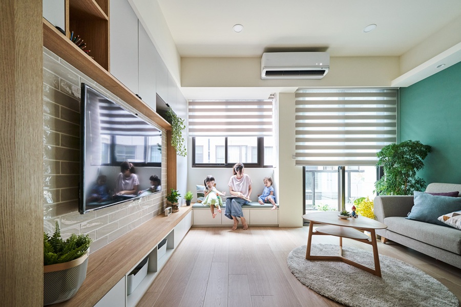 拆除了不必要的隔断,让客厅、窗边休憩区与采光区连为一体,视觉上放大了空间感。大面积的百叶帘和玻璃窗保证了充足的自然光,同时也能灵活调节光线强度。窗边设置了卡座式休憩区,既是家人互动的温馨角落,也能作为临时收纳空间使用。电视墙采用半墙+木质层板的设计,既满足了视听功能,又不会阻碍空间的通透感。
