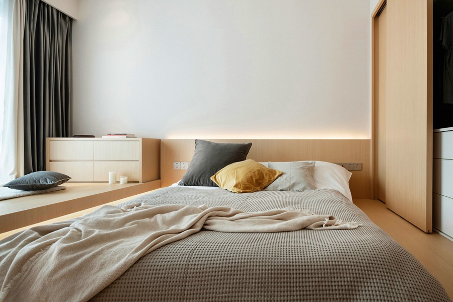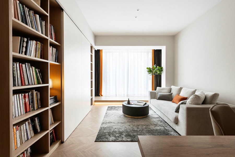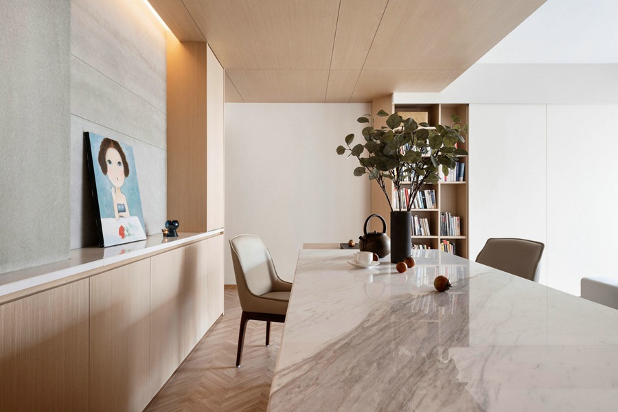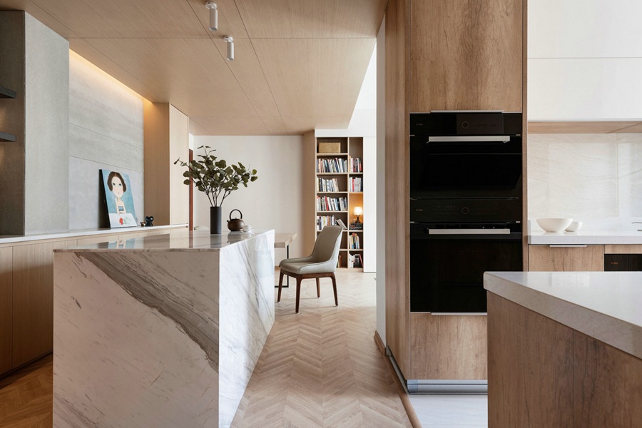 以浅木色作为空间基底,搭配肌理感的浅灰墙面与白色大理石台面,整体色调柔和统一,传递出温暖质朴的侘寂美学。鱼骨拼木地板增加了空间的层次与温度,弱化了大面积石材带来的冷硬感。超长的大理石中岛既是备餐区,也是家人互动的社交核心,兼顾实用性与仪式感。