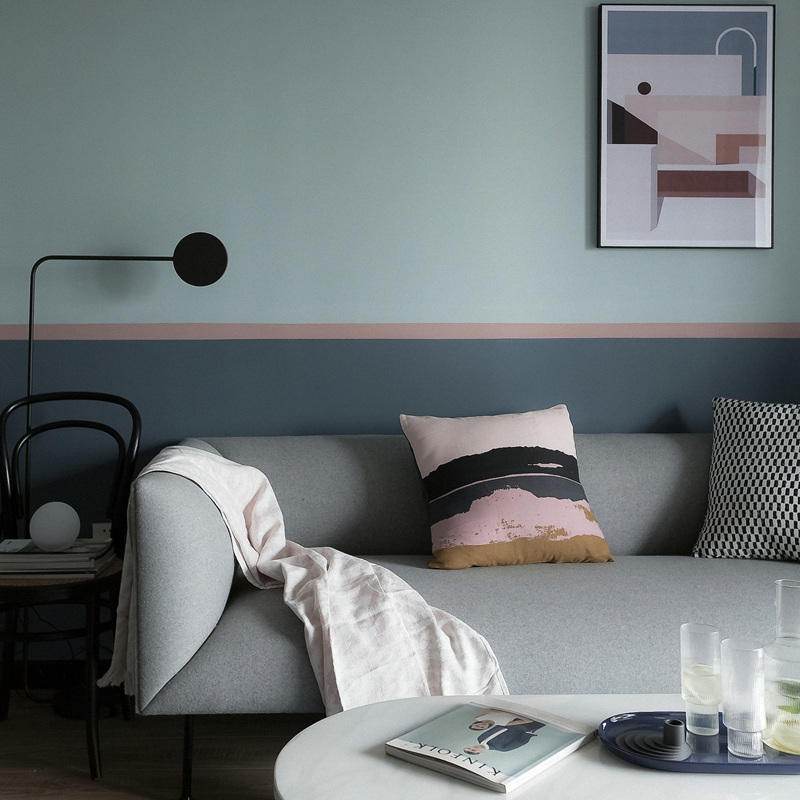 - 色彩层次:墙面采用浅薄荷绿与深海蓝的上下