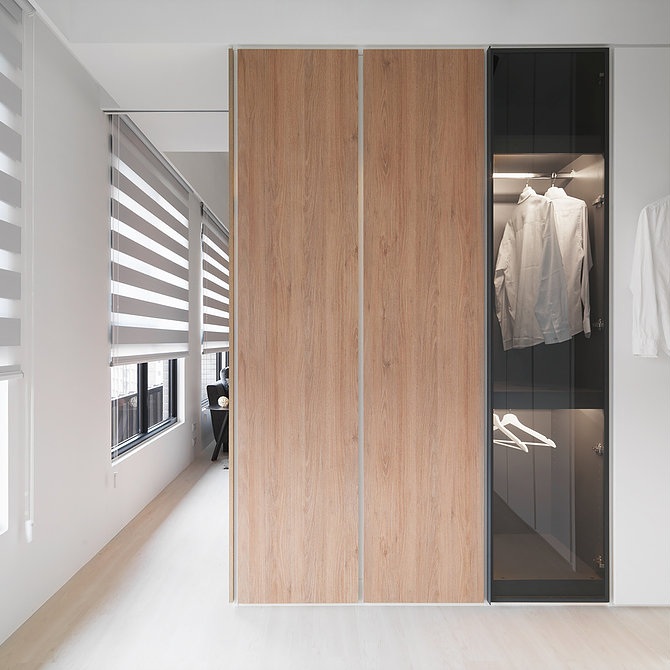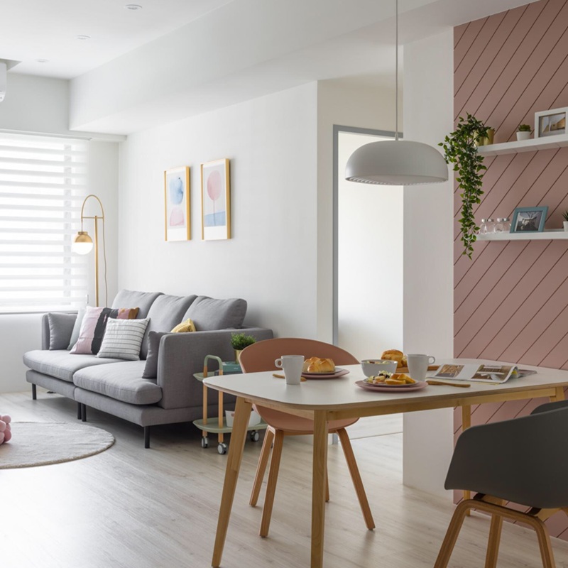 - 色彩搭配:左侧入户门采用低饱和度的脏粉色,搭配几何线条造型,成为视觉亮点。整体空间以浅木色、米白