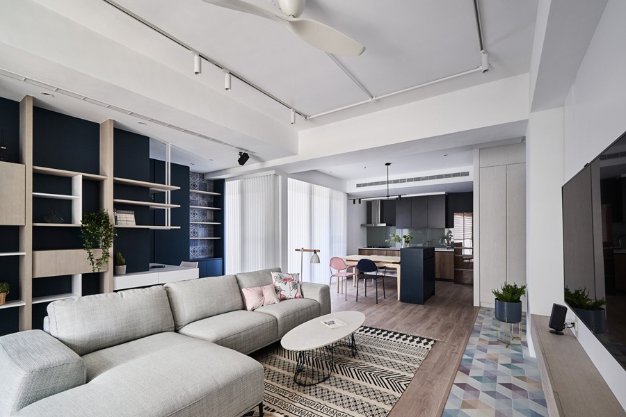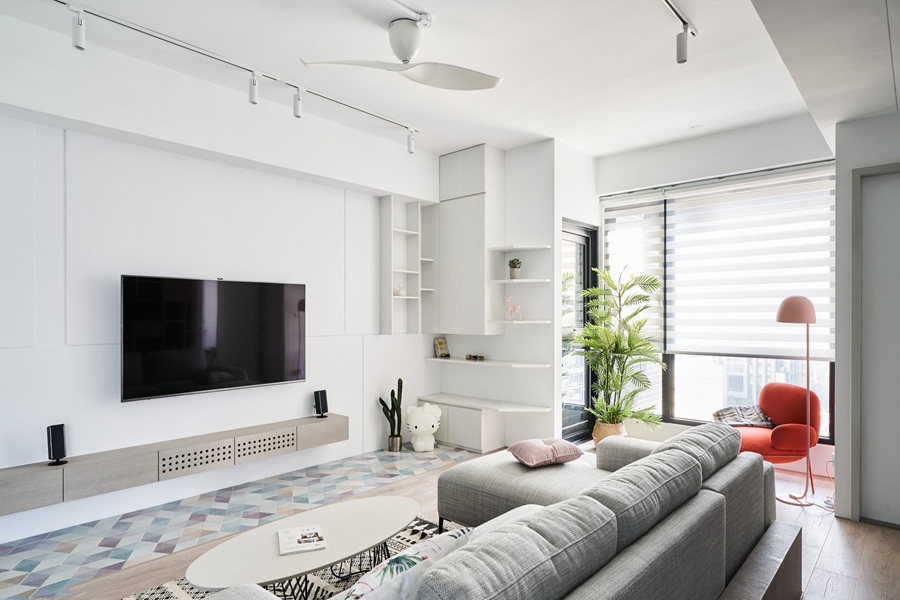 - 材质与色彩:白色墙面搭配浅木色地板奠定清爽基调,电视背景墙的几何花砖成为视觉焦点,既划分了功能区,又增添了空间层次。