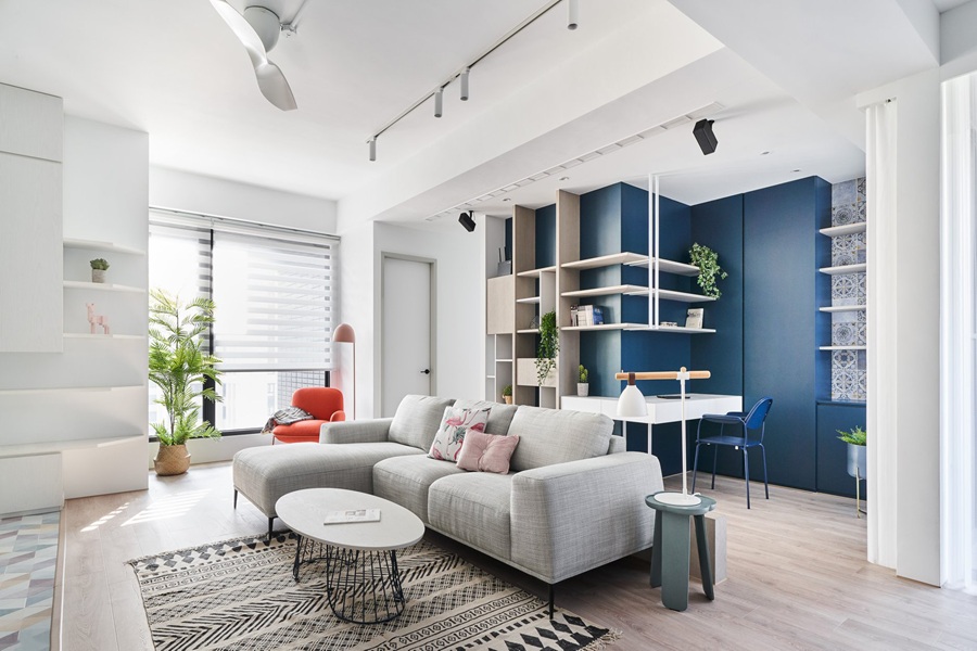 - 软装细节:极简的无主灯设计搭配轨道灯,让光线分布更均匀;仙人掌与白色玩偶摆件则为冷色调空间注入了趣味与生机。