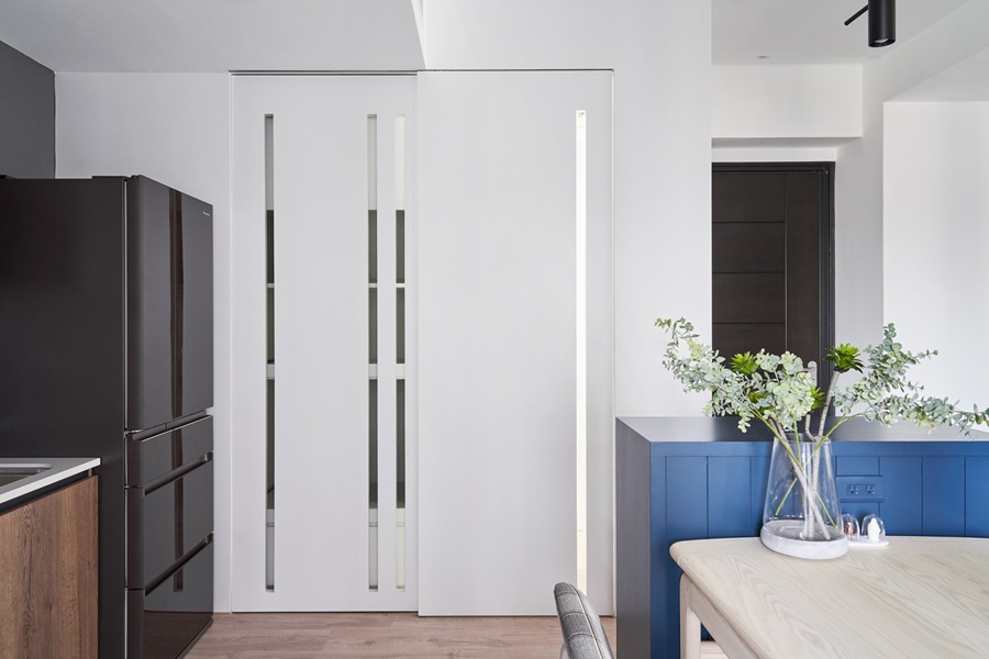 这是一个现代极简风格的客餐厨一体化空间设计,整体以白色和浅木色为基底,通过简洁的线条与灵活的布局,打造出通透开阔的居住体验。
