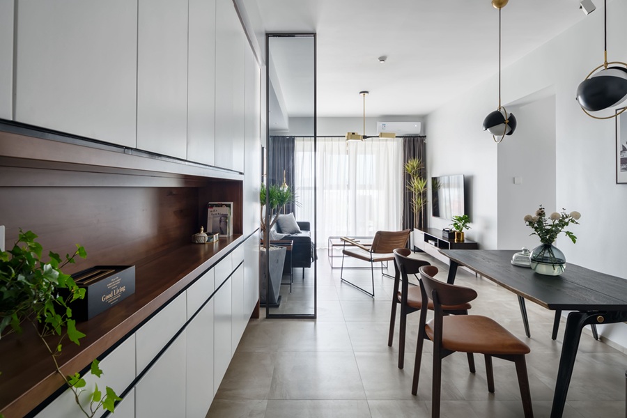 - 采光与通透感:整面落地窗搭配双层窗帘,既能保证充足的自然采光,又能通过纱帘柔化光线,避免空间过于硬朗。
