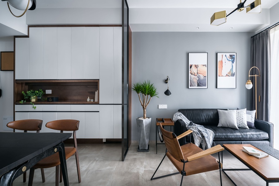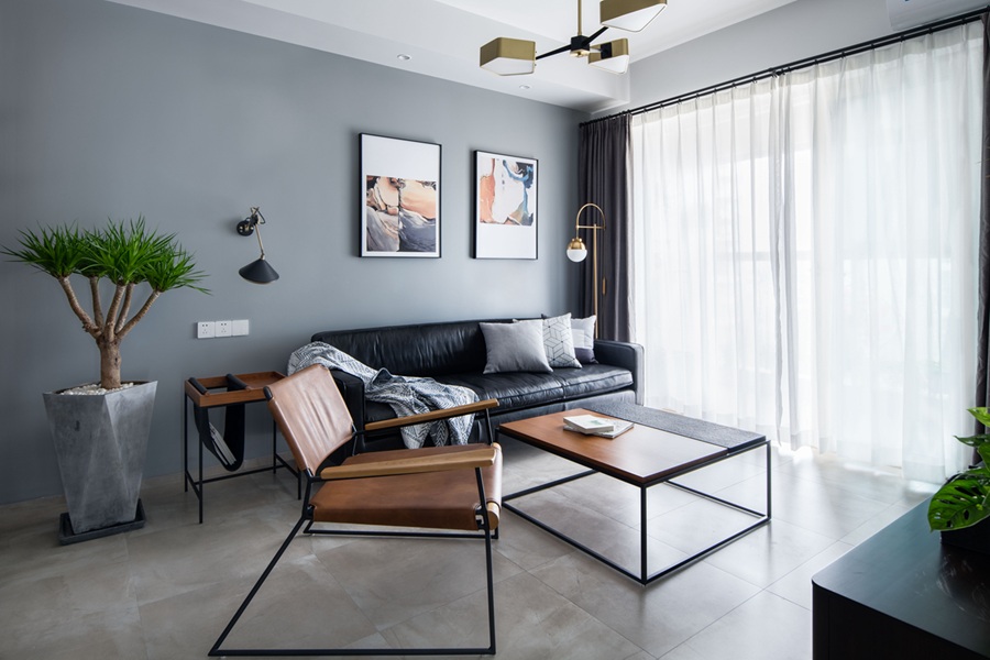 - 色彩与材质:以高级灰墙面为基底,搭配黑色皮质沙发、金属框架家具与焦糖色皮质单椅,冷暖对比鲜明,营造出沉稳又不失温度的氛围。