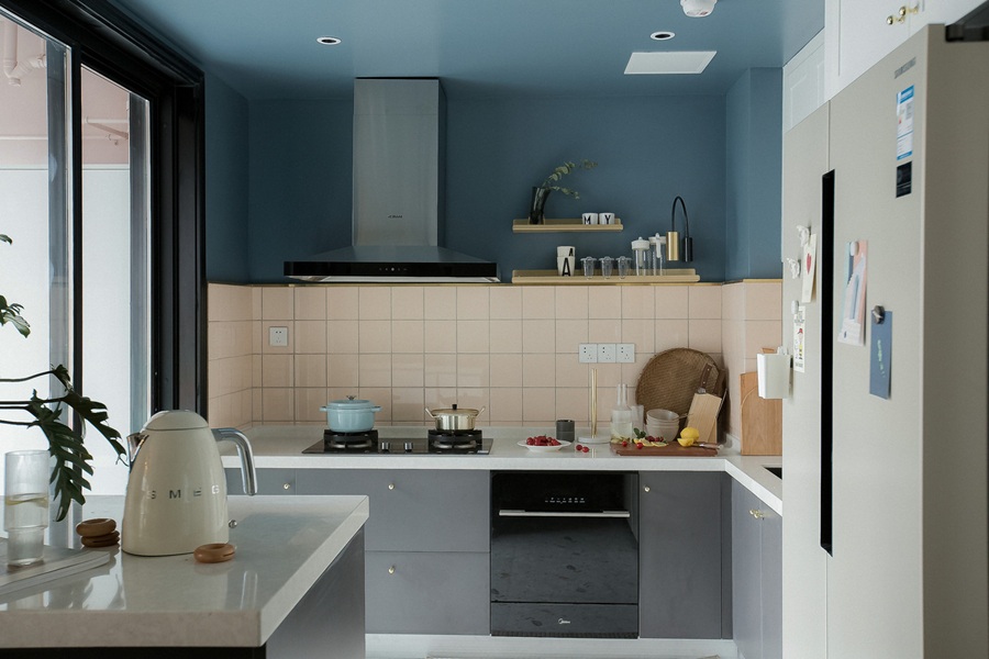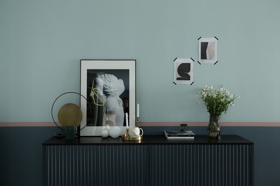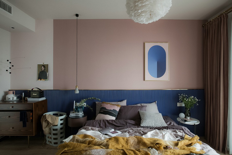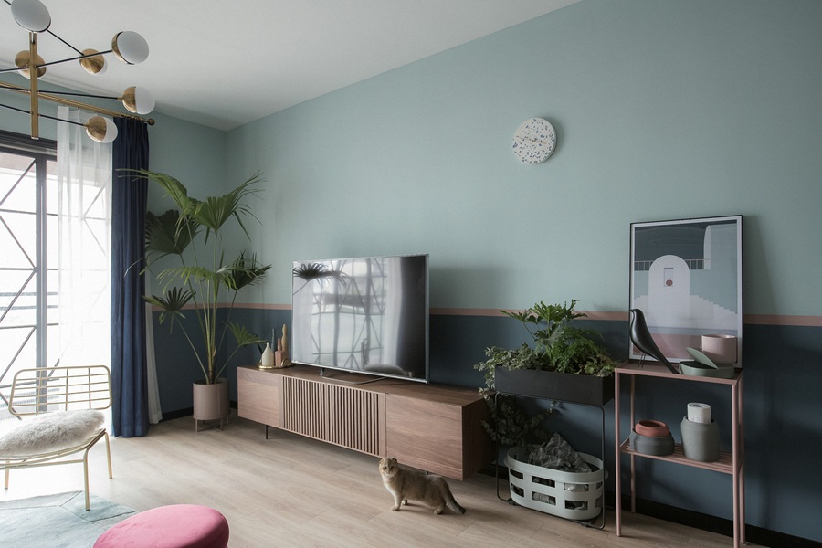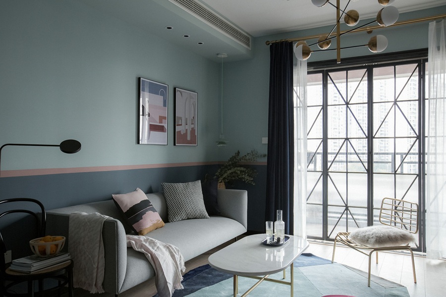 - 色彩层次:墙面采用浅薄荷绿与深海蓝的上下分色设计,中间以浅粉色金属线条过渡,打破了单色墙面的单调感,视觉上更具呼吸感与活力。